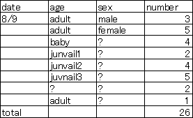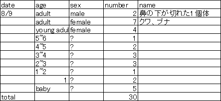 O群 8月6〜11日まで調査が行われた。 *構成;O-1群:細間林道下細間入口付近、11時12分から11時35分 *構成;O-2:海峡ラインM字カーブと蛎崎越し林道起点の中間6時26分から6時45分 O-1群は8月10日、11日ともに細間林道周辺で確認された。O-2群は8月9日カウント後、武士泊林道を越えて声が聞こえなくなった。 男川の群れ 8月8日、10日、11日の3日間行われた。10日に古い食痕(アケビ)とサル糞が確認されたが、それ以外の情報はなかった。 大荒川、長右ェ門の群れ 8月8〜11日まで調査が行われた。8月10日に大荒川、長右ェ門分岐から500M付近の長ェ門林道上でハナレザル2頭が確認された。うち、1個体は15歳前後で左の鼻穴に傷があった。もう1個体は12歳前後。調査を通じ、少数のサル糞とエビガライチゴの食痕が確認された 牛滝の群れ 8月9日、10日の2日間調査が行われた。8月9日国道338号線牛滝集落入り口から800Mの地点右岸側(国道下斜面)で4頭目撃。年齢性別不明。現場にいたサル追いの人によると、Z2Bと思われる。8月10日にはサル情報がなかった。 ハナレサル情報 8月10日、17時43分サル山公苑と国道の間でA♂(ややわかめ)が目撃された。このサルは、11日にも観察されている。 タイワンザル情報 今調査中、タイワンザルは確認されなかった。 2004年度夏季調査は京都大学霊長類研究所野外観察施設から調査費の一部を援助していただきました。 文章・小堀 睦 |